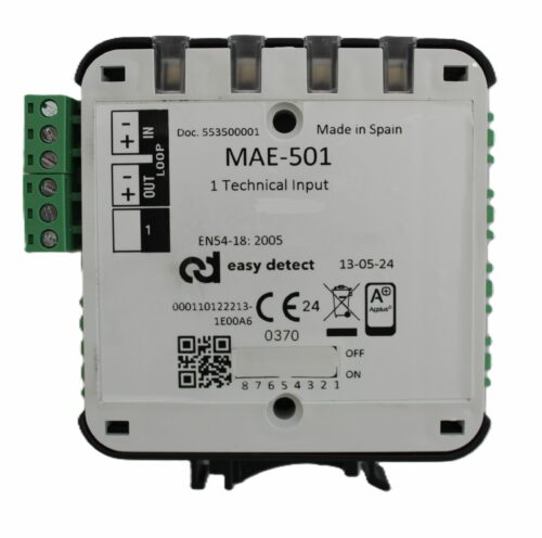 Adresabilni nadzirani tehnički ulazni modul sa jednim programabilnim NO ili NC ulazomza. Sa AF ultrabrzim komunikacijskim protokolom. Direktno napajanje iz petlje zauzima jednu adresu. Mala kutija sa LED indikatorom statusa. Uklonjivi pojedinačni terminalni blokovi. Instalacija na DIN ili ravnu šinu sa mogućnošću ugradnje ONE-BOX ili SIX-BOX kutije. Crna i bijela boja. Dimenzije 92 x 105 x 22 mm. CPR EN54-18 certificirano. Izvedbe sa i bez izolatora