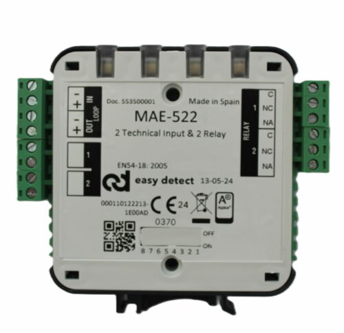 Adresabilni nadzirani tehnički ulazni modul sa dva programabilna NO ili NC ulazomza. Sa AF ultrabrzim komunikacijskim protokolom. Direktno napajanje iz petlje zauzima dve adrese. Mala kutija sa LED indikatorom statusa. Uklonjivi pojedinačni terminalni blokovi. Instalacija na DIN ili ravnu šinu sa mogućnošću ugradnje ONE-BOX ili SIX-BOX kutije. Crna i bijela boja. Dimenzije 92 x 105 x 22 mm. CPR EN54-18 certificirano. Izvedbe sa i bez izolatora
