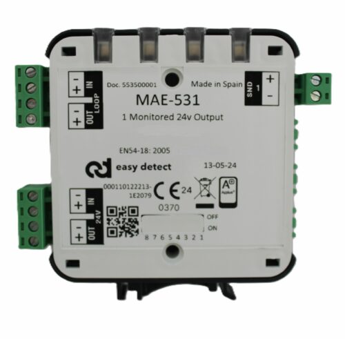 24V nadzirani adresabilni izlazni upravljački modul za opremu koja zahteva 24Vdc napajanje naprimer optičko-akustička signalizacija, detekcija prekida ili kratkog spoja na navedenoj liniji. Zahteva 24Vdc pomoćno napajanje i zauzima jednu adresu. Sa AF Ultrabrzim komunikacijskim protokolom. Mala kutija sa LED indikatorom statusa. Pojedinačno uklonjivi terminalni blokovi. Instalacija na DIN ili ravnu šinu sa mogućnošću ugradnje u ONE-BOX ili SIX-BOX kutiju. Crna i bijela boja. Dimenzije 92 x 105 x 22 mm. CPR EN54-18 certificiran. izvedbe sa ili bez izolatora