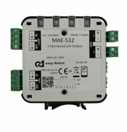 24V nadzirani adresabilni izlazni upravljački modul sa dva izlaza za opremu koja zahteva 24Vdc napajanje naprimer optičko-akustička signalizacija, detekcija prekida ili kratkog spoja na navedenoj liniji. Zahteva 24Vdc pomoćno napajanje i zauzima dve adrese. Sa AF Ultrabrzim komunikacijskim protokolom. Mala kutija sa LED indikatorom statusa. Pojedinačno uklonjivi terminalni blokovi. Instalacija na DIN ili ravnu šinu sa mogućnošću ugradnje u ONE-BOX ili SIX-BOX kutiju. Crna i bijela boja. Dimenzije 92 x 105 x 22 mm. CPR EN54-18 certificiran. izvedbe sa ili bez izolatora