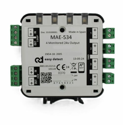 24V nadzirani adresabilni izlazni upravljački modul sa četri izlaza za opremu koja zahteva 24Vdc napajanje naprimer optičko-akustička signalizacija, detekcija prekida ili kratkog spoja na navedenoj liniji. Zahteva 24Vdc pomoćno napajanje i zauzima dve adrese. Sa AF Ultrabrzim komunikacijskim protokolom. Mala kutija sa LED indikatorom statusa. Pojedinačno uklonjivi terminalni blokovi. Instalacija na DIN ili ravnu šinu sa mogućnošću ugradnje u ONE-BOX ili SIX-BOX kutiju. Crna i bijela boja. Dimenzije 92 x 105 x 22 mm. CPR EN54-18 certificiran. izvedbe sa ili bez izolatora